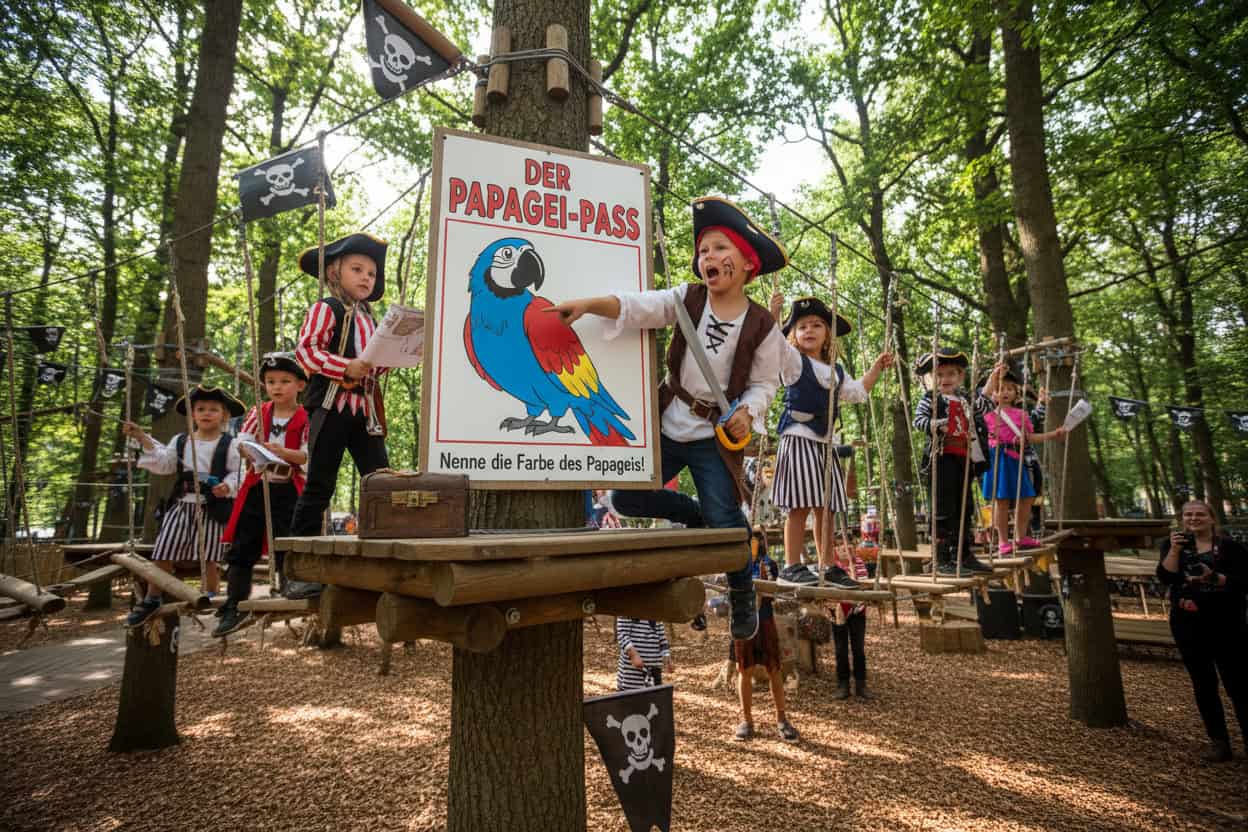 Auf der geführten Schatzsuche „Der verlorene Schatz des Käpt’n Jones“ lösen die Kinder spannende Rätsel, meistern Teamaufgaben und tauchen in eine Welt voller Abenteuer ein. Begleitet von einem echten Piraten, wird der Geburtstag zum unvergesslichen Erlebnis – wahlweise einzeln oder in Kombination mit den Kletterparcours.